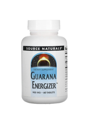 Source Naturals, Guarana Energizer™, 60 таблеток Дієтична добавка. Не є лікарським засобом. Опис Дієтична добавка Підходить для вегетаріанців Гуарана — це натуральна рослина, імпортована з Бразилії. Його протягом століть використовували корінні американці Амазонки як енергійний засіб. Поживна цінність Розмір порції: 1 таблетка Кількість в 1 порції % від добової норми Кальцій (у вигляді двозаміненого фосфату кальцію) 44 мг 3 % Екстракт насіння гуарани (21 % кофеїну) 900 мг † † Добову норму не визначено. Рекомендації із застосування Приймати по 1 таблетці двічі на день. У разі розладу шлунку приймати під час їди. Інші інгредієнти Двозамінений фосфат кальцію, сорбітол, стеаринова кислота, гідроксипропілцелюлоза, модифікована целюлозна камедь, діоксид кремнію. Містить пшеницю. Не містить дріжджів, молочних продуктів, яйця або сої. Не містить цукру, консервантів, штучних барвників, ароматизаторів і ароматичних композицій.