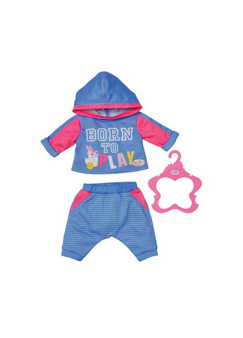 Набір одягу для ляльки BABY born спортивний костюм для бігу (блакитний) Малята BABY Вorn дуже жваві та полюбляють активний спосіб життя. Яскравий новий блакитний спортивний костюм для ляльки дозволить зробити ігри з нею ще яскравішими та веселішими! Штанці та кофтинка з капюшоном із милими малюнками та життєрадісними написами додадуть нових емоцій до ігор із лялькою. До комплекту входять: кофта з капюшоном; штанці. Підходять для ляльок висотою до 43 см. Гра з цими яскравими аксесуарами допоможе дитині розвинути почуття стилю, уяву та долучить малюка до активного способу життя. Рекомендовано для дітей віком від 3 років.