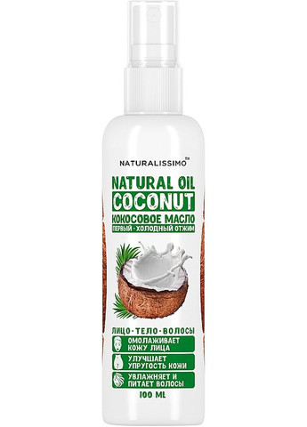 Колекція натуральних косметичних засобів українського бренду Naturalissimo відкриває безмежні можливості для сяйва жіночої краси, дбайливого і ефективного догляду за обличчям, тілом та волоссям. Coconut Oil Cold Pressed від Naturalissimo – б'юті-продукт, який стане цінним поповненням домашнього арсеналу косметики. Цей засіб дарує шкірі пружність і гладкість, допомагає уповільнити її старіння, сприяє зменшенню целюліту і розтяжок, дарує волоссю блиск і шовковистість. Особливості Naturalissimo Coconut Oil Cold Pressed: - містить нерафіновану олія кокосу холодного віджиму; - може застосовуватися для догляду за шкірою обличчя і тіла, для оздоровлення і поліпшення стану волосся; - містить високу концентрацію поживних речовин; - містить олеїнову, фолієву, каприлову, пантотенову кислоти; - захищає шкірний покрив від сухості й впливу ультрафіолетового випромінювання; - живильна і зволожувальна дії; - сприяє процесам регенерації; - підвищує пружність і еластичність шкіри; - допомагає у боротьбі зі зморшками, розтяжками і целюлітом; - усуває сухість, ламкість і посіченість волосся; - зручний формат спрею; - приємний аромат кокоса; - добре всотується.