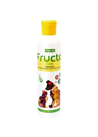 Гігієнічний шампунь Фрукта для довгошерстих собак та кішок. Збалансований pH, очищає та зволожує шерсть, робить її шовковистою, надає блиску та сприяє легкому розчісуванню. Натуральні ягідні екстракти смородини, вишні, малини, винограду та вітаміни Е, А, D, B5 заспокійливо діють на шкіру, пом'якшують шерсть та запобігають її сплутуванню. Застосування: Нанесіть невелику кількість на вологу шерсть, помасажуйте до спінювання. Уникайте контакту з очима та потрапляння води у вуха. Змийте теплою водою. За потреби повторіть процедуру. Склад: вода пом'якшена, лаурилсульфат натрію, дієтаноламід кокосової олії, кокоамідопропіл бетаїн, кокоглюкозид, динатрій кокоамфодіацетат, гліцерин, акрилатний полімер, хлорид натрію, натуральні фруктові екстракти смородини, вишні, малини, винограду, вітаміни Е, А, D, B5, лимонна кислота, віддушка, консерванти. Виробник - Magic Pet, Україна.