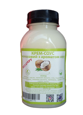 КРЕМ-СОУС КОКОСОВО-СИРНИЙ Легка, біла злегка солонуватий маса, з характерним сирним ароматом і смаком і легким відтінком кокоса. Соус ніжний не жирний, не нудотний Склад: кокосова олія, кокосові вершки, сіль гімалайська, лимонна кислота, крохмаль, аромат сиру, сорбат калію. Використовується як самостійна страва, як намазка в бутербродах, складова частина салатів. Поживна (харчова) цінність 100 г: білків — 0 г, жирів — 7 г, вуглеводів — 24 г. Енергетична цінність (калорійність) 100 г: 156 ккал. Вироблено відповідно до ТУ У 15.3-33550052-001:2005. Вага — 250 г. Доступні фасування Крем-соусу Декларація якості та відповідальності виробника: Продукція з кокосовою олією: 1) Температура плавлення кокосової олії +24. За температури нижче цієї вона твердне, що може поміняти консистенцію продукту (перехід у желеподібний стан без зміни якості продукту). Для отримання рідкого, рідкого продукту, його треба потримати в теплій не гарячій воді та перемішати. НЕ ДОПУСКАЄТЬСЯ: зберігання продукту за температури нижче ніж +1 (це веде до розшаровування рідини) Виробник не несе відповідальності за невідповідність умов зберігання. УВАГА: враховуйте це під час замовлення на поготів узимку. Споживач для відновлення властивостей продукту може підігріти його до температури, близької до кипіння, та перемішати. Сиропи та розчини на еритриолі. У разі перенасичених концентратів еритритола допускається його кристалізація за температури зберігання нижче ніж +12 +14. Для відновлення властивостей сиропів його треба потримати в теплій негарячій воді та перемішувати до повного розчинення кристалів. НЕ КИПЯТИТЬ. 3) Гірчиці та соуси особливо чутливі до бактерій бродіння й гниття. Не допускається потрапляння слини, води в продукт після його відкриття, це неабияк скорочує термін зберігання. МИ СПЕЦІАЛЬНО ФАСУЄМО НАШИ ПРОДУКТИ В ПРОЗРАЧНУ ПАКОВКУ, ЩОБ ПОТРЕБНИК ВІДІДІЛ ЯКІСТЬ ПРОДУКТЯМНІСТЬ ПРОДУКТОВАНІСТЬ ВИЗВОЧЕННЯЛЮВАЛЮ 1. Виробник не несе відповідальності за пошкодження товару службами доставки (Укрпошта, Новою поштою). Але виробник гарантує повернення повної вартості пошкодженого товару, якщо споживач склав АКТ дефектації (пошкодження) товару в службі доставки, — на день надання такого Акта виробника. 2) Виробник упродовж 14 днів від дати отримання товару Споживачем, компенсує вартість товару внаслідок його псування, якщо це не пов'язано з порушенням умов зберігання товару Споживачем, за максимально простою процедурою: фото пошкодженого/ зіпсованого товару та опис проблеми на вайбер сайту.Декларація якості та відповідальності виробника: Продукція з кокосовою олією: 1) Температура плавлення кокосової олії +24. За температури нижче цієї вона твердне, що може поміняти консистенцію продукту (перехід у желеподібний стан без зміни якості продукту). Для отримання рідкого, рідкого продукту, його треба потримати в теплій не гарячій воді та перемішати. НЕ ДОПУСКАЄТЬСЯ: зберігання продукту за температури нижче ніж +1 (це веде до розшаровування рідини) Виробник не несе відповідальності за невідповідність умов зберігання. УВАГА: враховуйте це під час замовлення на поготів узимку. Споживач для відновлення властивостей продукту може підігріти його до температури, близької до кипіння, та перемішати. Сиропи та розчини на еритриолі. У разі перенасичених концентратів еритритола допускається йо