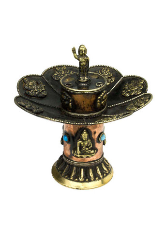Це спеціальне пристосування для запалювання пахощів зробить процес обкурювання естетичнішим, практичнішим, зручнішим і безпечнішим, допоможе уникнути займання та пропалювання поверхонь. Палички пахощів встановлюються в отвір підставки та підпалюються. У міру згоряння палички попіл збирається на підставці. Підставка виконана з металу у вигляді стиліпокликаної квітки лотоса. Лотос – символ чистоти, адже він росте у бруді, але його пелюстки залишаються чистими. Так само і Будди залишаються чистими від світу бажань та уподобань. Пелюстки лотоса прикрашені зображеннями Восьми Символів Щастя. Парасолька уособлює захист розуму від спекотної спеки затьмарена, а також оберігає від страждань. Риби - символ позбавлення страждань і досягнення духовного визволення. Ваза символізує виконання всіх бажань, як тимчасових, так і найвищого – здобуття визволення та Просвітлення. Лотос символізує чистоту вчення та очищення тіла, мови та розуму, що призводять до Просвітлення. Раковина символізує звук Учень Будди, що поширюються всюди вільно і пробуджують учнів від сну незнання. Нескінченний вузол уособлює повне здобуття Невимірних Достоїнств та П'яти видів споконвічної Мудрості, символ взаємозалежності всіх явищ і живих істот у Всесвіті. Прапор символізує перемогу вчення Будди над невіглаством та смертю. Колесо Дхарми символізує проповідь Вчення Будди, що несе визволення всім живим істотам. Заснування курильниці декороване зображенням ваджру. Ваджр (Дордже) (Тіб). алмаз) - символ Просвітлення у буддизмі. Дордже уособлює силу і твердість духу, а також вічність і непорушність (наприклад, обітниця). Має символічну аналогію з алмазом - може різати будь-що, але не сам себе. Ваджр - атрибут багатьох будд, бодхісатв та ідамів, символізує чоловічий початок, шлях, майстерні засоби, співчуття. На вершині курильниці символізує буддійську ступу – символ природи розуму. Згідно з поглядами буддистів, ступи мають силу добра, допомагають людям, які їх відвідують, внести гармонію в своє життя, очистити себе від різних пороків і розвинути в собі чесноти. Матеріал: метал. Колір: мідний. Ручна робота. Розмір: 12,7x12,7x12,8 см. Країна-виробник: Непал.