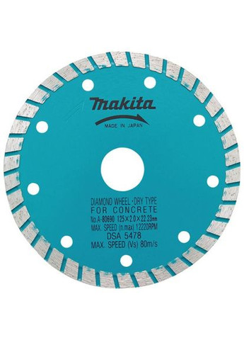 Алмазний диск 125 мм Makita (A-80690) Диски Makita для бетону – це алмазні диски, призначені для використання з кутовими шліфувальними машинами (болгарками). Вони є чудовим рішенням для обробки бетону та мармуру. Міцні та надійні, диски Makita для бетону відрізняються тривалим терміном служби та простотою у використанні. Основні особливості A-80690: Сегментований алмазний диск для сухого різання.Призначений для різання наступних матеріалів: твердий бетон, граніт, гнейс, вуглець, бруківка, тверда цегла, бетон цегла, бордюр, цементна плитка, мармур. Комплект постачання A-80690: Алмазний диск Makita A-80690 Виробник має право змінювати комплектацію та конструкцію не вносячи змін до інструкції та без повідомлення.