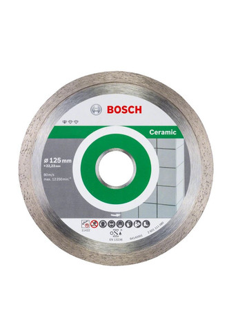Алмазний відрізний круг Standard for Ceramic надійно ріже плитку Суцільна ріжуча кромка гарантує точність різання плиткиЦентр алмазних технологій Bosch у Швейцарії забезпечує незмінну якістьЗ отвором 22,23 мм для кутових шліфувальних машин із стандартною затискною гайкою. Комплект поставки: Алмазний диск Bosch - 1 шт