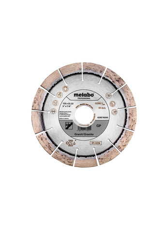 Алмазний відрізний диск по граніту Metabo GP Granite Professional 125x22,23 мм - спеціально розроблений для різання граніту та терраццо-пластин. Високоякісні алмазні сегменти забезпечують чудову продуктивність і зносостійкість. Цей диск належить до професійного класу. Висота алмазного сегмента 12 мм. Переваги для користувача: Потужний алмазний відрізний круг із сегментованим краєм для агресивного швидкого відрізання твердих матеріалів, з великою продуктивністю відрізання і дуже добрим терміном експлуатації Найкраще підходить для всіх типів граніту, терраццо-пластин Найвищий рівень безпеки завдяки звареним лазером алмазним сегментам. Висота сегмента 12 мм В комплект поставки входить Алмазний відрізний диск по граніту Metabo GP Granite Professional 125x22,23 мм, картонна коробка Виробник має право змінювати комплектацію і конструкцію не вносячи змін до інструкції і без повідомлення.