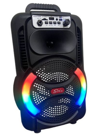 Портативна колонка ZPX ZXX-1011 з 2 мікрофонами та пультом Акустична система 800Вт RGB підсвічування Чорний - Телескопічна ручка та коліщатка для зручного транспортування Музичний чемодан на колесах ZXX-1011 підключається по bluetooth зі смартфоном, планшетом або ноутбуком, можливе підключення через AUX з пристроями, що володіють цим роз'ємом. В аудіосистему на передній панелі вбудований MP3 плеєр з розширенням для USB, microSD, карток SD. На плеєрі розташовані кнопки керування відтворенням музики. Переваги: Акустика виконана з високоякісних зносостійких матеріалів, а завдяки ручкам і колесам, що складаються, можна легко носити її з собою в будь-яке місце. Є вхід під акустичну стійку 5-ти смуговий еквалайзер Висувна рукоятка зверху. Можливість запису вашого співу на флешку через вхід USB. Індикація заряду акустики. Характеристики: Номінальна потужність: 800 Вт Пікова потужність RMS: 200 Вт Опір: 4 Ом АКБ 12 вольт 7 Ah Еквалайзер на пульті керування: Rock/Pop/Jazz/Clasic/ Динаміки: Динамік Низьких Частот - 1х15" (дюйми) Днамік Високих Частот (твіттер) - 1х3" (дюйма) Частота: 50 Гц – 20 кГц Чутливість: 95 +/- 3 дБ FM-радіо : Так Bluetooth: Так USB вхід: Так SD card вхід: Так FM радіо: Так (88-108 mHz) Радіомікрофон: 2 шт (Працює в радіусі 50 метрів від колонки) Напруга живлення: 110-240V Вбудований акумулятор: Так (Робота акустики до 10 годин без підзарядки) Можливе підключення додаткового джерела живлення на 12 вольт. Вага в упаковці: 13 кг Розмір коробки: 82х48х42 Три види живлення акустики (регулюється перемикачем на акустиці): Від вбудованого акумулятора. Від мережі 220V (від розетки). Від пританння 12V (тобто додаткового акумулятора) Регулювання керування гучності акустики: Управління гучності акустики: Загальне регулювання гучності акустики. Регулювання TREBLE (високих частот) для мікрофонів. Регулювання BASS (Низькі частоти) для мікрофонів. Управління гучністю мікрофонів: Спільне регулювання гучності мікрофонів. Регулювання ECHO для мікрофона. Функція пріоритету мікрофона над музикою. (Mic. priority) Управління гучністю гітари: Спільне регулювання гучності гітари. Вхід для підключення: USB вхід. SD/MMC Card вхід. Аудіо вхід (Audio input)/ для підключення ноутбука та інших пристроїв. Мікрофонний вхід: 2 шт. х Jack 6.3". Гітарний вхід: 1 шт. х Jack 6.3'. AUX 12V вхід для підключення додаткового живлення акустики Комплектація: Акустика ZXX-1011; Радіомікрофон – 2 шт; Пульт керування - 1 шт; Шнур живлення та зарядки; Кабель; Інструкція; Упаковка.