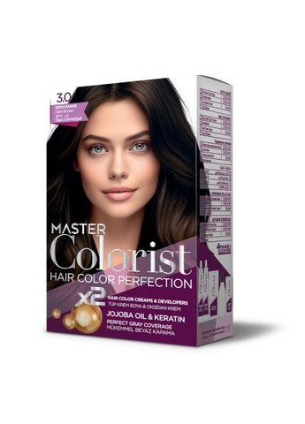 Особлива формула крем-фарби Master Colorist забезпечує глибоке проникнення фарби у волосся та повне зафарбовування сивини завдяки стійким кольоровим пігментам і спеціальним активним речовинам. Олія жожоба у складі живить кожну волосинку і надає вашим локонам неймовірного блиску протягом тривалого часу. Кератиновий бальзам, що наноситься після фарбування, зволожує та зміцнює волосся, полегшуючи розчісування. Вміст упаковки: • крем-фарба – 2 шт.*50 мл • окислювач 9% (30 vol) – 2 шт.*50 мл • бальзам для волосся з кератином – 10 мл • рукавички – 1 пара