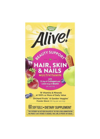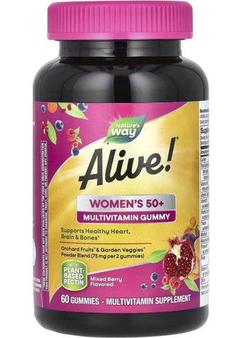 Жувальні мультивітаміни для жінок 50+ (Alive! Women's 50+ gummy) – це преміум формула, найповніший щоденний мультивітамінний комплекс для жінок після 50 років. Формула збалансована з урахуванням вікових особливостей. Виробник: Natures Way, США Форма випуску: 60/130 жувальних цукерок Вік: 50+ Склад: Компонент Склад 2 жувальних цукерок Калорії 20 ккал Усього вуглеводів 5 г Усього цукру 4 г Вітамін A (у вигляді ретинілпальмітату) 450 мкг Вітамін C (аскорбінова кислота) 30 мг Вітамін D3 (у вигляді холекальциферолу) 40 мкг Вітамін E (у вигляді dl-альфа токоферилацетату) 15 мг Тіамін (у вигляді тіаміну гідрохлориду) 0.3 мг Рибофлавін 0.33 мг Ніацин (у вигляді нікотинаміда) 4 мг Вітамін B6 (у вигляді піридоксину гідрохлориду) 1.7 мг Фолієва кислота 240 мкг Вітамін B12 (у вигляді ціанокобаламіну) 4.8 мкг Біотин 30 мкг Пантотенова кислота (у вигляді d-пантотенату кальцію) 1.3 мг Кальцій (у вигляді трикальційфосфату) 100 мг Фосфор (у вигляді трикальційфосфату) 50 мг Йод (у вигляді йодиду калію) 150 мкг Цинк (у вигляді цитрату цинку) 2.7 мг Натрій 15 мг Порошкові суміші Orchard Fruits™ та Garden Veggies™ 75 мг Бор (у вигляді борату натрію) 150 мкг Лютеїн (з екстракту квіток чорнобривців) 300 мкг * Порошкові суміші Orchard Fruits™ та Garden Veggies™: апельсин, лохина, морква, слива, гранат, полуниця, груша, яблуко, буряк, малина, ананас, гарбуз, вишня, цвітна капуста, виноград, банан, капуста, томат , асаї, спаржа, брюссельська капуста, журавлина, огірок, горох, броколі, шпинат. Інші інгредієнти: Сахароза, патока, очищена вода, пектин, лимонна кислота, натуральні ароматизатори, цитрат натрію, овочевий та фруктовий сік (барвники), кокосова олія, карнаубський віск. Не містить: Глютен, желатин, молочні продукти, пшениця, арахіс, яєць. Веганський продукт. Функціональна дія: Вітамін А необхідний для швидкого загоєння ран, має хороший омолоджуючий ефект. Вітаміни Е та С є антиоксидантами та допомагають боротися з вільними радикалами в організмі, особливо ефективні у боротьбі з ознаками старіння шкіри. Вітамін С важливий для зростання та відновлення тканин всього організму. За допомогою вітаміну С в організмі синтезується колаген – важливий білок, який бере участь у регенерації клітин шкіри, хрящів, сухожиль, зв'язок, кісток, зубів. Вітамін С зміцнює стінки судин і необхідний для загоєння ран і блокує ушкодження, викликані вільними радикалами - речовинами, які ушкоджують ДНК. Вітаміни B12 та біотин допомагають в енергетичному метаболізмі. Вітамін B6 сприяє регуляції гормональної активності. Вітамін D та кальцій для підтримки нормальних кісток. Біотин сприяє підтримці нормального стану волосся та шкіри. Застосування: Приймати по 2 жувальні цукерки на день. Протипоказання: Індивідуальна непереносимість компонентів. Застереження: При вагітності, годуванні грудьми, прийомі медичних препаратів чи наявності будь-яких захворювань слід проконсультуватися з лікарем перед вживанням харчових добавок. У разі виникнення побічних реакцій припиніть використання та проконсультуйтеся з лікарем. Зберігати у недоступному для дітей місці. Не використовувати, якщо зовнішня захисна мембрана відсутня чи пошкоджена. *** Виробник залишає за собою право змінити зовнішній вигляд упаковки. Ми намагаємося стежити за змінами, але якщо ви помітили будь-яку невідповідність, будь ласка, повідомте нам про це в листі або коментарі до товару. Дякуємо! **** БАД не є лікарським засо
