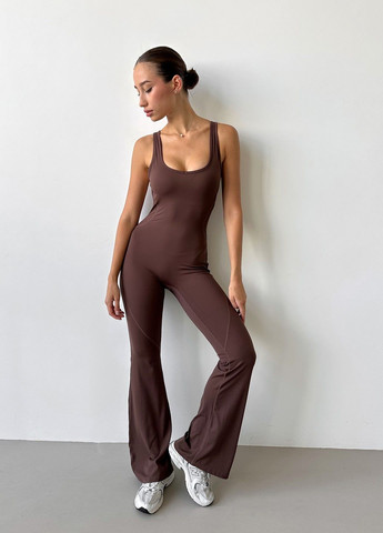 Комбінезон для занять спортом, йогою, фітнесом або танцями. Має оригінальний дизайн з відкритою спинкою та штанами кльош, що гарно підкреслює фігуру. Тканина дуже м'яка, приємна та еластична, чудово прилягає до тіла.