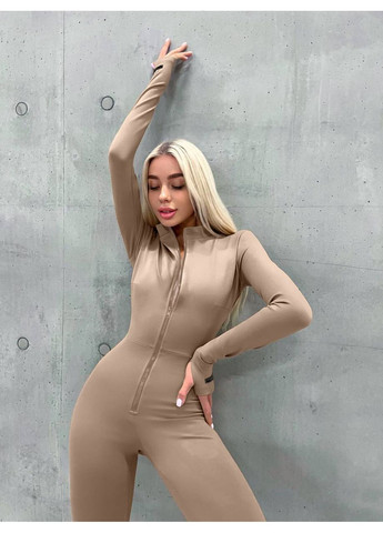 Жіночий комбінезон облягаючого крою з еластичної тканини. Модель має довгі рукави та високу горловину-стійку. Спереду застібається на блискавку, що дозволяє регулювати глибину вирізу. Завдяки щільному матеріалу комбінезон підкреслює силует і забезпечує комфортну посадку. Ідеальний вибір для стильних повсякденних образів, вечірніх виходів або фотосесій.