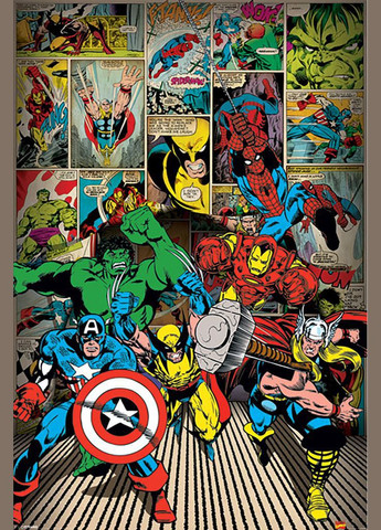 На цьому яскравому, барвистому плакаті зображені практично всі дійові особи із серії коміксів Marvel, які з'явилися за роки існування Marvel (Universe), в тому числі як нестаріючі герої, такі як Людина-павук, Халк, Залізна людина, Тор, Капітан Америка, Люди Ікс, так і відносно нові персонажі - Дедпул, Люк Кейдж і багато інших. Серед цього дивного співтовариства супергероїв затесалися і не менш відомі, але не настільки доброзичливі особи Таноса, Червоного Черепа і Венома, які як і раніше готові нести хаос в навколишній світ. Зібрати їх разом на одному постері було чудовою ідеєю, яка припаде до душі багатьом шанувальникам коміксів від Marvel. Яскравий постер - це ідеальний спосіб доповнити інтер'єр приміщення, а також створити певну атмосферу і підкреслити індивідуальність, що живуть або працюють в ньому людей. Пропоновані в нашому магазині плакати представляють собою ліцензійну продукцію від англійського виробника. Тобто на їх випуск отримано офіційний дозвіл правовласника. Це важливо як з точки зору законності, так і з точки зору оплати роботи художників, фотографів і дизайнерів, які працювали над створенням постерів. Для їх виготовлення використовується спеціальна високоякісний папір щільністю 150 г/м². Зображення наноситься методом 3-шарової літографічної друку, який дозволяє добитися ідеальної передачі кольору, щільності і насиченості кольору і чіткої, якісної графіки. Крім незаперечних естетичних якостей у плакатів є ще одна важлива перевага - їх дуже просто повісити або, при необхідності, зняти. У нашому інтернет-магазині без проблем можна знайти постер, який органічно впишеться в загальну стилістику інтер'єру і зробить його більш живим.