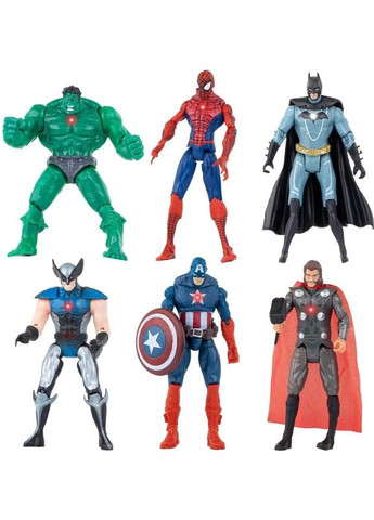 Увага!!! Всі фігурки абсолютно нові та мають такий самий вигляд, як і на фото, але йдуть без оригінального роздрібного паковання та запаяні в пластикові пакети. Фігурки Супергероїв — з найпопулярніших коміксів і кінофільмів останніх років. Кожна з фігурок має безліч точок артикуляцій, а також світловий індикатор для підсвічування в темряві. Персонажі: Тор є сином Одіна, царя Асгарда. Він ріс разом зі своїм молодшим сестрою Локі, не знаючи, що той є названим сином. Тор і Локіажалі на історіях Одіна про минуле, особливо на історії Великої війни між Асгардіанцями й Єтунами. У дитинстві Тор із усіх сил намагався показати батькові, що хоче стати великим воїном. Пітер Паркер — Людина-павук знаходить старий портфель батька, з його робочими документами та фотографією з колеги, яким опиняється доктор Курт Коннорс, провідний генетик компанії «Оскорп». Паркер проникає в науковий центр «Оскорпа», знаходить секретну частину лабораторії з незвичайними павуками, який і в кінцевому підсумку і вкусив юнака... Брюс Беннер (англ. Bruce Banner) — вчений, експерт із гамма-бомбе, більш відомий як Халк (англ. Hulk). Беннер ввів сироватку собі та підніс себе впливу великої кількості гамма-радіації. Це призвело до того, що Беннер перетворився на м'язистого некерованого гіганта, який трощив усе навколо та не знав, що відбувається... Росомаха (Джеймс Хоулетт)— мутант, який має надлюдські здібності. Він має регенерацію, яка дає йому виживати після важких поранень, смертельних для звичайної людини. Більшість отрут і хвороб також не можуть вбити та заподіяти важку шкоду здоров'ю Росомахи. Його здатність також підвищує витривалість і спритність, загострює його органи чуття, уповільнює старіння організму Бетмен — таємне альтер-его мільярдера Брюса Вейна, успішного промисловця, філантропа та улюбленця жінок. У дитинстві, ставши свідком вбивства своїх батьків, Брюс поклявся присвятити своє життя викоріненню злочинності та боротьбі за справедливість. Капітан Америка (Стивен Ро'джерс) — супергерой із коміксів компанії Marvel Comics. Одягнений у костюм, пофарбований на мотив американського прапора, й озброїний непорушним щитом із вібраніум-сталевого сплаву, який можна використовувати як зброю.