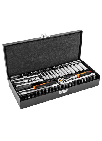 Набір торцевих ключів NEO (арт. 10-008) — ідеальне рішення для професіоналів і любителів, яке включає повну гаму інструментів розміром ¼”, упакованих у міцний металевий кейс з фірмовим логотипом. У складі набору 63 предмети, виготовлені з високоякісної хромованадієвої сталі, що гарантує довговічність і надійність у використанні. У наборі ви знайдете широкий асортимент шестигранних змінних головок розміром від 4 до 14 мм, включаючи короткі та подовжені варіанти для зручного підбору інструменту під елемент, що відкручується. Додатково, у кейсі представлені E-образні головки для все частіше використовуваних гвинтів TORX. Торцеві головки зі змінними наконечниками забезпечують комфорт, міцність і економію часу завдяки можливості швидкої заміни. У наборі є 4 подовжувача, Т-образний вороток, шарнір і тримач викруткових наконечників ¼”, що дає вам повну свободу у підборі інструменту для будь-яких завдань. Перехідник до шуруповерта дозволяє використовувати набір як доповнення до електроінструментів. Трещотка ¼” з вигнутою рукояткою та 90 зубцями забезпечує роботу в обмеженому просторі завдяки дрібному кроку механізму в 5 градусів. Усі предмети акуратно розміщені в пластиковому ложементі, що дозволяє швидко знаходити потрібний інструмент. Якість і надійність інструмента підтверджені 25-річною гарантією та міжнародним сертифікатом TÜV, що робить цей набір незамінним в арсеналі кожного майстра. Обирайте надійність і професіоналізм з набором торцевих ключів NEO!