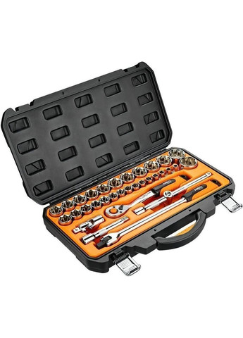 Набори інструментів STORM — це нове слово на підтримку якості та багатофункціональності! Завдяки своїй практичності ідеально підходять для автолюбів і домашніх майстрів. Особливості: Інструмент на довгі роки. Усі комплектуючі виготовлені зі Сr-V сталі, характеризуються винятковою міцністю та витримують чималі навантаження. Два шари нікелевого покриття вбережуть інструмент від корозії й у безліч разів продовжать термін експлуатації інструмента. Надійні тріскачкові ручки. Механізм тріскачок виготовлений у Тайвані, у поєднанні з Cr-V сталлю — це гідний і надійний інструмент. Зручне зберігання. Весь інструмент укомплектований у надійний, міцний кейс із металевими замками та посиленими петлями. Набори інструментів No1 в Україні. За результатами незалежного рейтингового дослідження в межах проєкту Українська Народна Премія 2018, 2019 років. Торцеві головки та тріскачка Всі комплектуючі механізму тріскачок на 72 зуби виготовлені на о. Тайвань. Вирізняються плавністю ходу та мають невеликий кут повернення — всього 50, завдяки чому працює швидко та точно. Вигнута форма тріскачки дає змогу дістати кріплення у важкодоступних місцях. Наявність реверсу та швидка зміна головок спростять Вашу роботу безліч разів! Головки туго сидять на посадкових квадратах 1/2", 1/4" і не спадають. Насічки на кожній головці покращують зчеплення з долонею в рукавичці або з забрудненою в мазуті руці. Сама тріскачка зручно лежить у руці завдяки двокомпонентній ручці з гумовими вставками. Кейс Усі інструменти упаковані в надійний і ударостійкий пластиковий кейс. Для збереження й максимального терміну експлуатації інструмента, у валізі передбачені спеціальні відсіки з фіксатором для зберігання кожної деталі окремо. Металеві замки вбережуть кейс від випадкового відкриття. Ящик легко переносити та зберігати, він компактний і не займає багато місця (375*295*85 мм). Сучасний яскравий дизайн кейса точно не залишить нікого байдужим! Матеріал виготовлення Усі головки та тріскачки набору виготовлені з флагманської та надійної сталі Cr-V 50BV30. Вирізняються винятковою міцністю і високим показником крутного моменту, стійкі до деформацій. Двошарове нікелеве покриття захищає від появи іржі, отже, інструмент слугує Вам набагато довше за подібні аналоги! Біти виготовлені зі сталі Cr-V 6150, з чудовими параметрами твердості та пружності. Переваги комплекту Головна особливість набору в його комплектації. Тут зібрані всі необхідні інструменти для заміни свічок запалювання, гальм і будь-якої іншої складної деталі автомобіля, розташованої в недоступних місцях. Також чудово підходить для дому, тому що має все необхідне для ремонту. У комплекті вороток, подовжувачі, головки та кардан, потрібні для відкручування гайок, болтів і шпильок у глибоких колодязях двигунів або в місцях, де складно їх дістати. Дві головки для зняття свічок запалювання (21 і 16 мм) дають змогу замінити свічки на автомобілі будь-якого виробника, включно з країнами ЄС. Різноманітні біти (SL, PZ, PH, M, TORX, HEX) стануть у пригоді для роботи з різними типами шліць, які використовують у меблевій промисловості, будівництві, машинобудуванні та ін. Комплектація Трикоткова ручка 1/2", 72 зуби, реверсійна; Головка шестигранная торцевая 1/2", 16 шт.: 10, 11, 12, 13, 14, 15, 16, 17, 18, 19, 20, 21, 22, 23, 24, 27 мм; Головка свічкова 1/2", 2 шт.: 16, 21 мм; Подовжувач 1/2", 125 мм; Кард