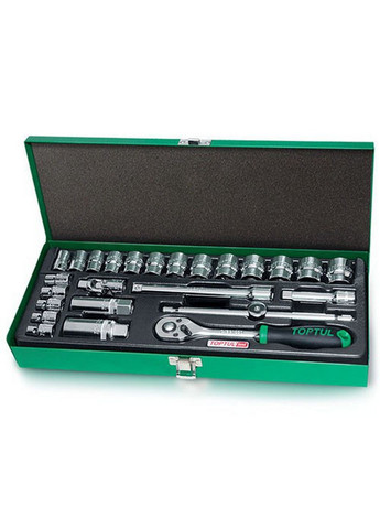 Комбінований набір інструментів TOPTUL 3/4" 26од. (12-гр.) метр+дюйм GCAD2608. Кейс виготовлений з металу. Габарити: ширина 53,6см, довжина 17,8см і висота 7,9см Набір закривається за допомогою двох замків, виконаних з металу. Кейс розділений на два відсіки, в одному розташовані головки, а в другому вільно розташований інший інструмент, що забезпечує зручне зберігання набору. Комплектація набору: 23 торцевих 12-гранних головок, 2 подовжувачі розміром на 100 і 200мм, комір з плаваючою головкою розміром 510мм і потужною тріскачкою на 24 зубці. Весь інструмент у наборі метричний та дюймовий. Приєднувальний квадрат 3/4 дюйми. Набір інструментів Toptul GCAD2608 виготовлений з високоякісних матеріалів, які можуть витримувати великі навантаження, забезпечуючи надійність та довговічність. Також є можливість придбання БУДЬ-ЯКОГО інструменту з набору TOPTUL GCAD2608 окремо. На всі торцеві головки та ключі TOPTUL з набору надається довічна гарантія на заводський шлюб! Кількість інструментів у наборі: 26; Набір ручного інструменту: набір автомобільного інструменту; Тип: Набір ручного інструменту; Кількість одиниць, : 26; Комплектація, : Вороток; Приєднувальний квадрат, : 3/4";
