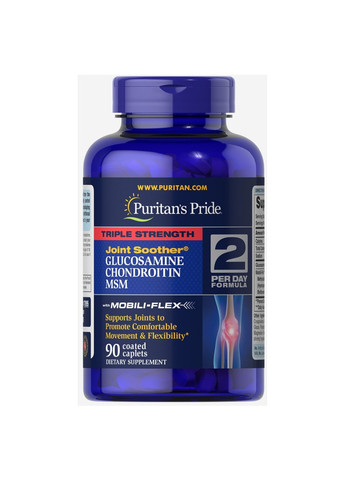 Підтримує здоров'я суглобів та хрящів Допомагає зміцнити, захистити та захистити суглоби Підтримує мобільність та гнучкість для комфортного пересування Містить тримісячний запас капсул потрійної сили Спосіб застосування: дорослим приймати по дві (2) капсули на день, бажано під час їди. Інші інгредієнти: рослинна целюлоза, повідон. Містить 2%: кросповідон, малодекстрин, натуральний карамельний барвник, натуральна глазур з пальмового листя, полісорбат 80, діоксид кремнію, барвник на основі діоксиду титану, тріацетин, рослинний магнію стеарат, рослинна стеаринова кислота. Містить інгредієнти молюсків (крабів, креветок, омарів, раків).
