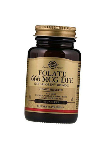 Folate 400 від Solgar – найефективніший вітамін для вагітних! Фолати – це похідна форма фолієвої кислоти чи вітаміну В9. Ці поєднання дуже важливі для людського організму, особливо для вагітних жінок. Тому американська компанія Solgar розробила комплекс на їх основі – Folate 400. Вперше про фолати вчені дізналися у 30-х роках ХІХ століття під час досліджень з лікування анемії у вагітних жінок. Сьогодні вже достеменно відома вся їхня користь. Фолат відповідає за нормальний ріст і клітинний поділ в організмі та сприяє виробленню еритроцитів у достатній кількості. При фолатному дефіциті у людини з'являється слабкість, втома, а також погіршується стан волосся і нігтів. Вони стають сухими та ламкими. При цьому страждає і шкіра, з'являється лущення та блідий колір обличчя. Особливо важливими є фолати для вагітних жінок, в організмі яких формується ембріон. Для його повноцінного росту та розвитку необхідна велика кількість фолату, адже він бере участь у закладанні серцево-судинної та нервової системи, відповідає за формування кісткового та головного мозку, рук та ніг, а також за протікання внутрішньоутробних процесів. Фолат бере участь у створенні головного захисного органу для дитини – плаценти. На її освіту потрібна велика кількість фолату. Додатково цього з'єднання потребує і сама майбутня мама, адже вона забезпечує киснем і себе, і дитину. Тому організм працює з подвоєною силою на вироблення еритроцитів і при фолатному дефіциті може призвести до анемії. Роль фолат дуже важлива ще до настання вагітності, адже його недолік призводить до безпліддя. Причому це стосується не лише жіночої статі, а й чоловічої. У чоловіків дефіцит призводить до появи малорухомих сперматозоїдів та їх нездатності запліднити яйцеклітину, а у жінок – до неможливості заплідненої яйцеклітини прикріпитися до стінки матки. Достатня кількість фолату в організмі вагітної захищає ембріон від появи патологій, сприяє нормальному зростанню та розвитку, а також руйнує амінокислоту гомоцистеїн. Остання може призвести до відшарування плаценти, дострокових пологів, утворення тромбів та народження маловагової дитини. Фолати швидко руйнуються під впливом сонячних променів та під час термічної обробки, тому важливо їх включати не лише разом із продуктами харчування, але й у вигляді фолатних комплексів. Folate 400 від Solgar – ідеальний продукт для насичення організму такою важливою активною речовиною! Склад: Склад на порцію - 1 таблетка: Фолат (400 мкг L-метилфолату) (як L-метилфолат у вигляді метафоліну) 666 мкг DFE Інші інгредієнти: маніт, мікрокристалічна целюлоза, рослинна стеаринова кислота, рослинна целлюзаза, рослинна целюлоза. Вільна З: клейковина, пшениця, молочні продукти, соя, дріжджі, цукор, натрію, штучні ароматизатори, консерванти та кольори. Приймайте 1 таблетку двічі на день, бажано з їжею. Попередження: Не використовувати, якщо у вас є алергія на будь-яке з'єднання. Не перевищувати добову дозу, що рекомендується. Проконсультуйтеся з лікарем під час вагітності або лактації. Харчові добавки не повинні використовуватися замість різноманітної та збалансованої дієти. Зберігати у недоступному для дітей місці. Зберігати у сухому та прохолодному місці. Захищати від прямих сонячних променів
