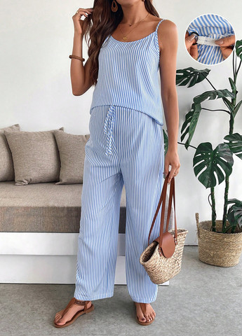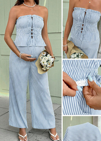 Костюм-двійка для вагітних SHEIN, синій із білим. Цей костюм складається з топа-бандо з круглим вирізом та розкльошених штанів. Костюм призначений для вагітних. Підходить для саду чи прогулянок містом. Костюм виготовлений з тканини, що складається з 95% поліестеру та 5% еластану. Рекомендації щодо догляду: прання машини або професійна хімчистка.