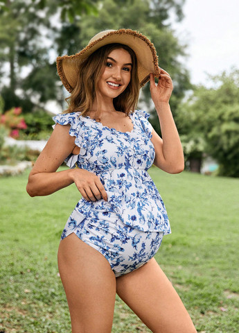 Комплект танкіні для вагітних прикрашений квітковим принтом. У комплект входить бюстгальтер та трусики з еластичної тканини. Модель передбачає овальний виріз.