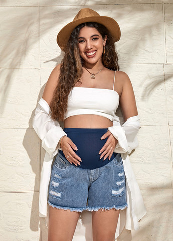 Шорти для вагітних із деніму – рваний дизайн. Ці шорти мають стандартний крій з необробленим краєм та рваними деталями. Тканина не тягнеться. У комплект входять фальшиві кишені.