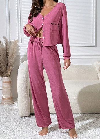 Жіночий піжамний комплект із овальним вирізом. У комплект входить лонгслів із довгими рукавами-кльош. Він виготовлений із еластичної тканини. Штани мають тонкий крій. Колір рожевий.