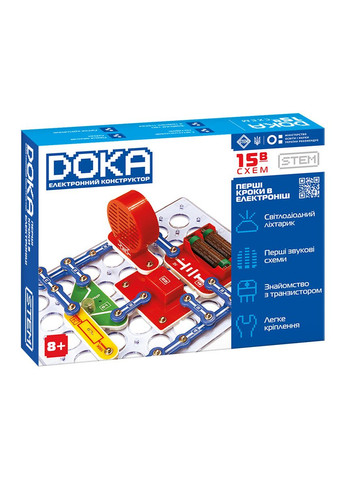 Конструктор електронний DOKA 'ПЕРШІ КРОКИ В ЕЛЕКТРОНІЦІ' (Набір В, 15 схем) безсумнівно сподобається юним дослідникам! Конструктор пропонує 15 різних схем, для збору яких дитина зможе скористатися провідниками, елементами живлення, резистором і транзистором, збираючи їх і відкриваючи для себе багато нового і цікавого, при цьому не використовуючи небезпечний метод паяння. Завдяки посібнику з поясненнями і цікавими завданнями, з'являється чудова можливість отримати базові знання в сфері електроніки та фізики. Конструктор DOKA також пройшов всі випробування в школах і інших дитячих установах і отримав високу оцінку фахівців. За допомогою конструктора можна зібрати такі схеми: Звук поліцейської машини при розриві дроту. Звук пожежної машини при розриві дроту. Звук іграшкового бластера при розриві дроту. Звук карети швидкої допомоги при розриві дроту. Проблисковий світлодіодний сигнал для захисту від злодіїв. Карета швидкої допомоги зі світловими і звуковими сигналом. Поліцейська машина зі світловим і звуковим сигналом. Пожежна машина зі світловим і звуковим сигналом. Звук поліцейської машини. Звук іграшкового бластера. Повільно блимаючий світлодіод. Поліцейська машина з червоним світлом. Попереджувальне червоне світло і звук іграшкового бластера. Тестер провідності. Пожежна машина. Конструктор складається з наступних елементів: Провід 1. Провід 2 - 7 шт. Провід 3 - 2 шт. Провід 4. Провід 5. Кнопка. Червоний світлодіод. Батарейний відсік. Сигнальна інтегральна схема. Резистор 100 кОм. Транзистор PNP. Монтажна плата. До комплекту також входить посібник, який містить теоретичні пояснення, питання та завдання. Набори «А» і «В» серії «Перші кроки в електроніці» можна поєднувати і доповнювати один з одним. Електронний конструктор розвиває у дитини: дрібну моторику увагу логіку память математичні здібності. Для роботи потрібні 2 батарейки типу АА (не входять до комплекту). Рекомендовано для дітей віком від 8 років.