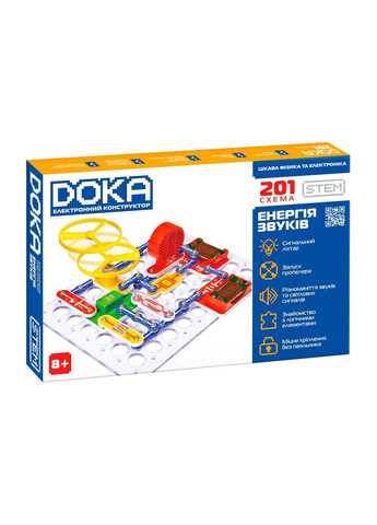 Конструктор електронний DOKA «201 СХЕМА» безсумнівно сподобається юним дослідникам! Конструктор дозволяє дитині своїми руками створювати музичні дзвінки, охоронні сигналізації, імітатори звуків, автоматичні освітлювачі, а також кумедні ігри та іграшки. Завдяки оригінальному способу з’єднання деталей Ви зможете домогтися швидкого і ефективного результату без використання паяння. За допомогою конструктора можна зібрати такі схеми: Пропелер, що літає. Лампа, що керується сенсором та звуком. Керовані звуки зоряних воєн, пожежної машини або швидкої допомоги. Музичний вентилятор. Лампа, що блимає і світлодіод у космосі. Сміх Будди. Блимаючий світлодіод, що керується магнітом. Автоматичний вуличний ліхтар. Тестер електропровідності. Вентилятор, що керується сенсором та магнітом. Звуки іграшкового бластера, що керуються світлом, дощем. Лампа, що керується електромотором. Музичний дверний дзвінок. Лампи при паралельному і послідовному з'єднанні. Лампа з яскравістю, що змінюється. Сигнальний ліхтар, що керується магнітом. Логічні елементи 'І', 'АБО', 'І-НЕ', 'АБО-НІ' та багато іншого. Конструктор складається з наступних елементів: Провід з 2, 3, 4, 5, 6 сполучними клемами. Шайба з 1 сполучною клемою. П'єзовипромінювач (звуковипромінювач п'єзоелектричний). Сенсорна пластина (сенсор). Геркон (магнітокерований контакт). Кнопковий вимикач (кнопка). Вимикач. Фоторезистор (світлочутливий резистор). Червоний світлодіод. Лампа 2,5v. Динамік (гучномовець). Музична ІС (інтегральна схема). Сигнальна ІС (інтегральна схема). ІС (інтегральна схема) 'зоряні війни'. Електромотор. До комплекту також входить інструкція, за допомогою якої малюк зможе зібрати 201 електросхему, що дозволяють на практиці освоїти ази управління світлом, звуком, електрикою і водою. Електронний конструктор розвиває у дитини: дрібну моторику увагу логіку память математичні здібності. Для роботи потрібні 4 батарейки типу АА (не входять до комплекту). Рекомендовано для дітей віком від 8 років.