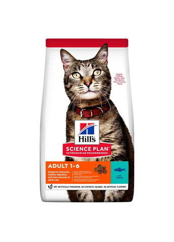 Корм Hill's для молодих дорослих котів, з тунцем Спеціально розроблений для задоволення енергетичних потреб котів у розквіті сил. Виготовлений з високоякісних і легкозасвоюваних інгредієнтів. Переваги: містить вітамін E та омега-3 й омега-6 жирні кислоти для збереження здоров'я та краси шкіри та шерсті дорослого кота таурин, незамінний для здоров'я серця, а також збалансований рівень мінералів для здоров'я нирок та сечового міхура високоякісний білок для формування та підтримки м'язової маси дорослого кота розроблений для підтримки оптимальної фізичної форми виготовлено з високоякісних інгредієнтів Склад корму для котів Дегідратований білок курки та індички, кукурудза, пивний рис, тваринний жир, кукурудзяний глютен, дегідратований білок із тунця, мінерали, сушена м'якоть буряка, дигест, риб'ячий жир. Добавки (на кг): залізо - 52,3 мг, йод - 2,3 мг, мідь - 5,2 мг, марганець - 5,4 мг, цинк - 81,1 мг; з натуральними антиоксидантами. Поживні речовини: білок - 31,3%, вміст жиру - 19,5%, сира клітковина - 0,96%, сира зола - 5,5%, омега-3 жирні кислоти - 0,4%, омега-6 жирні кислоти - 3,0%, кальцій - 0,89%, фосфор - 0,71%, натрій - 0,36%, калій - 0,68%, магній - 0,07%; на кг: вітамін А - 5875МО, вітамін D3 - 615МО, вітамін Е - 625 мг, вітамін С - 90 мг, бета-каротин - 1,5 мг. Енергетична цінність: 4058 ккал/кг Спосіб застосування Сухий корм Hill's Science Plan Adult рекомендований для дорослих котів віком від 1 до 6 років. Зміцнює імунітет, підтримує здорове травлення та м’язову масу у котів. Давати щодня з розрахунку ваги та фізичного навантаження улюбленця. Дотримуйтеся норм годування, зазначених у таблиці на пакунку, але також враховуйте індивідуальні потреби вашого кота. При переході з одного корму на інший рекомендовано робити це поступово, щоб організм тварини зміг адаптуватися до нового раціону. Поступово додавайте новий корм до попереднього, щоденно збільшуючи кількість нового корму і зменшуючи кількість попереднього, поки не відбудеться повної заміни. У середньому процес переходу на новий корм триває 5-7 днів. Корм рекомендовано пересипати у спеціальний контейнер з кришкою для зберігання харчових продуктів. Важливо: Слідкуйте за тим, щоб ваш улюбленець завжди мав доступ до чистої води! Кошенята, Вагітні або лактуючі кішки не повинні споживати цей корм. Під час вагітності або лактації кішок рекомендовано годувати кормом Hill's Science Plan Kitten.