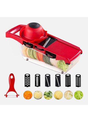 Мультистайлер овочерізка ручна Mandoline Slicer на 1.5 л 6в1 для овочів і фруктів з контейнером слайсер терка міні комбайн Червона Овочерізка Mandoline Slicer 6 в 1 терка з контейнером мультислайсер терка, мультирізка - незамінний помічник на кухні. З її допомогою можна нашаткувати овочі, фрукти або інші продукти різними способами. В комплекті - 6 насадок для шинкування. Контейнер, в який потрапляють нарізані продукти, оснащений гумовими ніжками, це запобігає зісковзування зі столу під час роботи. Для шинкування, овочі або фрукти закріплюється в спеціальному утримувачі, це робить роботу з теркою максимально безпечною. Характеристики Mandoline Slicer 6 в 1: Тип- ручна овочерізка Кількість насадок -6 штук Матеріали: ABS-пластик + нержавіюча сталь Обʼєм контейнера -1,5 літра Розмір контейнера - 22 × 9 см Вага : 485 г Розміри в упаковці: 32×10×11,5 см Країна виробництва:Китай Комплектація Mandoline Slicer 6 в 1: Основа корпус з посадками для всіх насадок Контейнер (прозорий) для збирання нарізаних продуктів, Кришка до контейнера Насадки: 6 штук для різних типів нарізки Захисний тримач направляючий Овочечистка ніж-чистка для зняття шкірки з овочів фруктів Коробка