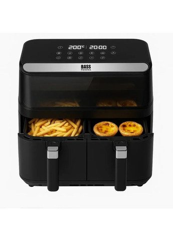 Аерофритюрниця - мультипіч подвійна Bass Polska BH 10890, 8.5 л, 2800 Вт Bass Polska BH 10890 — двокамерна аерофритюрниця (мультипіч) для термообробки продуктів циркуляцією гарячого повітря. Конструкція з двома незалежними шухлядами дозволяє готувати різні страви одночасно без змішування смаків. Особливості та переваги Два незалежні відсіки — паралельне приготування різних страв із власними налаштуваннями часу та температури. Загальний корисний об’єм 8.5 л — підходить для сімейних порцій або кількох страв за один цикл. Потужність до 2800 Вт — швидкий вихід на робочий режим і стабільна конвекція гарячого повітря. Діапазон температур 60–200 °C — налаштування під різні продукти: овочі, м’ясо, риба, випічка, снеки. Таймер до 60 хв — точний контроль тривалості приготування без необхідності відкривати шухляди. Сенсорна панель з LED-індикацією — вибір режимів, відображення часу і температури, швидка корекція параметрів. Прозорі віконця у шухлядах (за наявності в конкретній комплектації) — візуальний контроль процесу без переривання циклу. Антипригарні кошики — зручне виймання готових страв і спрощене очищення після роботи. Автовимкнення після завершення циклу — зручно в щоденному використанні; стійкі ніжки фіксують прилад на робочій поверхні. Де може застосовуватись Щоденне приготування вдома: основні страви, гарніри, снеки без додавання олії. Паралельні задачі на кухні: одночасне запікання м’яса й овочів із різними параметрами. Невеликі заклади з помірним потоком: швидке розігрівання або допікання порційних страв. Комплектація Аерофритюрниця Bass Polska BH 10890 (дві шухляди/кошики з антипригарним покриттям) Інструкція користувача Упаковка виробника