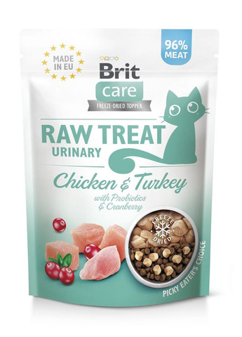 Ласощі Raw Treat з куркою, індичкою та журавлиною для стерилізованих котів. Це ідеальне поєднання неймовірного смаку та незрівнянних поживних властивостей для підтримки для здоров'я сечової системи котів! Снеки Brit Raw Treat freeze-dried виготовляють методом сухої заморозки, що дозволяє зберегти максимум поживних речовин. Такі ласощі легко засвоюються, це робить їх ідеальним вибором для улюбленців із чутливим шлунком або проблемами травлення. Але це ще не все Brit Raw Treat freeze-dried за своєю поживністю схожі на продукти для сироїдіння або BARF-дієти. На 96% складаються зі свіжого м яса. Журавлина природна підтримка сечової системи. Пробіотики підтримують здоров я кишечника та імунітет. Натуральні. БЕЗ штучних консервантів, ароматизаторів, барвників, доданої солі. Гідролізовані дріжджі забезпечують необхідні поживні речовини та підтримують належне здоров я кишечника. Lactobacillus інактивовані для імуномодулюючого ефекту. Brit Raw Treat можна використовувати, як смачні ласощі, що їх так люблять коти, а також, як універсальні добавки, що урізноманітнюють щоденну їжу вихованців, надаючи їй додаткового смаку та поживних речовин, та роблячи час прийому їжі цікавим і корисним для здоров'я. Склад: обрізки свіжої курятини (70%), обрізки свіжої індички (26%), лігноцелюлоза (2%), журавлина (1%), гідролізовані дріжджі (0,5%, джерело інозиту та амінокислот), інактивовані бактерії та їх частини ( Lactobacillus helveticus HA 122, 15x109 клітин/кг). Аналітичний склад: сирий протеїн 42,0 %, сирий жир 35,0 %, вологість 4,0 %, сира зола 10,0 %, сира клітковина 2,5 %, кальцій 3,0 %, фосфор 2,0 %, натрій 1,0 %.Містить природні антиоксиданти: екстракти токоферолу з рослинної олії (1b306(i)), аскорбілпальмітат (1b304). Містить схвалені ЄС консерванти: лимонна кислота (1a330). Енергетична цінність: 4,870 ккал/кг Поради з годування: Ласощі Raw Treat RAW TREAT створені для доповнення, а не заміни повноцінного та збалансованого раціону. Давайте приблизно 2 шматочки на 1 кг ( kg ) ваги кота, але не більше 10% від щоденного раціону тварини. Якщо ласощі завеликі для вашого кота, подрібніть їх перед подачею. Для покращення апетиту подрібніть 5 - 10 шматочків на звичайний корм вашого кота. Слідкуйте, щоб у кота завжди було вдосталь свіжої питної води.