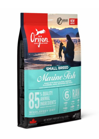 ORIJEN - став піонером серед Біологічно відповідних кормів та харчування, створеного у співвідношенні WholePrey. Біологічно відповідні раціони відтворюють багатство, свіжість та різноманітність м'ясних раціонів WholePrey, до споживання яких кішки та собаки пристосувалися протягом еволюційного розвитку. Саме тому, свіже чи сире м'ясо птиці, риби та високопоживні органи – це завжди перші П'ять інгредієнтів у списку кормів ORIJEN. Раціон Оріджен Смол Брид Марін Фіш: на 85% створений з інгредієнтів високої якості, включаючи сирий лосось, сиру оселедець, сиру камбалу, сирий цільний хек, морського окуня та солей. ORIJEN™ Small Breed Marine Fish створений спеціально для собак, які віддають перевагу смаку риби, або мають харчову чутливість до м'яса птиці. Перші 6 інгредієнтів – це інгредієнти із сирої риби. Включає м'ясо, органи та кістки, забезпечуючи повноцінне та збалансоване живлення, без штучних барвників, ароматизаторів та консервантів. Без інгредієнтів із птиці. Ця рецептура не містить жодних інгредієнтів із птиці. Тільки інгредієнти з риби Потужне джерело есенціальних протеїнів, вітамінів та мінералів Високопротеїновий раціон для підтримки високих енергетичних потреб собак та для збалансованого харчування сприяє підтримці здорової ваги. Фріз Драйд покриття гранул забезпечує інтенсивний аромат сирих інгредієнтів, яких інстинктивно прагнуть собаки. Гранули меншого розміру, створені спеціально для собак малих порід, наприклад, чихуахуа, йоркшир тер'єр, ши-тцу, італійський грейхаунд, уіппет, кокер спанієль. Склад: лосось сирий (17 %), сирий цільний оселедець (16 %), камбала сирий (7 %), сирий цільний хек (6 %), сирий цільний морський окунь (6 %), сира цільна солея (6 %), оселедець дегідратований (5 %), дегідратований сардин макрель дегідратована (5 %), путасу дегідратована (5 %), червона сочевиця, горошок, нут цільний, зелена сочевиця, клітковина з сочевиці, квасоля строката, соняшникова олія, олія з оселедця (2%), квасоля біла, сирі новозеландські мускатний гарбуз, свіжий гарбуз, висушений корінь цикорію, свіжі яблука, свіжа морква, свіжі груші, цукіні, юкка мохаве, свіжа зелень буряків, капуста калі, свіжий шпинат, свіжа зелень ріпи, ягоди журавлини, ягоди журавлини корінь лопуха, лаванда, корінь алтея, шипшина. Добавки (на кг): Технологічні добавки: 1b306(i) Екстракти токоферолу з олії: 121 мг, 1a330 Лимонна кислота: 40 мг. Сенсорні добавки: Екстракт розмарину: 80 мг, Харчові добавки: 3b606 (Цинк: 80 мг), 3b406 (Медь: 11 мг), 3a821 вітамін B1: 110 мг, 3a825i вітамін B2: 20 мг, 4 кальцію-D-пантотенат: 60 мг, 3a831 вітамін B6: 35 мг, 3a316 фолієва кислота: 7 мг, вітамін B12: 0,2 мг, 3a700 Вітамін E: 500 МО. Зоотехнічні добавки: 4b1707 Enterococcus faecium DSM 10663/ NCIMB 10415 1 x 109 КУО. Аналітичний склад: протеїн 40%, жир 15%, зола 10%, клітковина 4%, вологість 12%, Кальцій 1,5%, Фосфор 1,1%, Омега-6 жирні кислоти 2%, Омега-3 жирні кислоти 2%, ДГК/ЕПК 0,5%/. Калорійність (розрахована): Енергетична цінність становить 3710 ккал/кг (445 ккал на мірну склянку 250 мл/120 г).