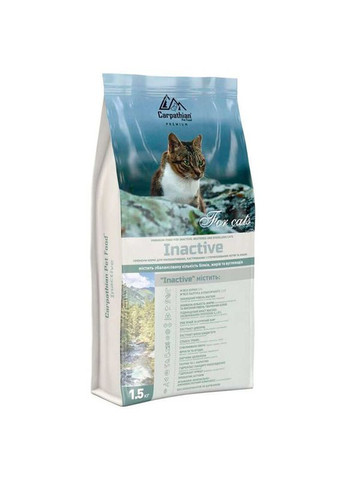 Преміум корм ТМ Carpathian Pet Food «Inactive» для малоактивних, кастрованих і стерилізованих котів та кішок, всіх порід. Наші експерти потурбувалися про безпеку здоров’я малоактивних, кастрованих і стерилізованих котів та кішок, тому знизили рівень жирів і вуглеводів, пропорційно збільшуючи вміст протеїну. Саме завдяки цьому, знижений ризик виникнення ожиріння, зменшене навантаження на опорно-рухову, серцево-судинну та сечовивідну системи. Вміст у кормі L-карнітину посилює процес розщеплення жирів, сприяє зниженню надлишкової ваги, посилює білковий обмін, що покращує тонус м'язів і підтримує роботу серця. Корм «Inactive» має підвищений вміст вітамінів: А, Е, групи В. Компоненти корму зі збільшеною кількістю клітковини покращують функції кишечника, підвищують рівень травлення та запобігають виникненню запорів. Вміст цинку дає позитивний вплив на шкіру та шерсть. Знижений рівень Магнію (Mg) попереджує виникнення сечокам’яної хвороби. Тільки повноцінне харчування ТМ Carpathian Pet Food «Inactive», для малоактивних, кастрованих і стерилізованих котів та кішок, здатне забезпечити нормальну життєдіяльність Вашого улюбленця.
