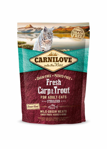 Коти — унікальні та незалежні тварини, які люблять м'ясо. Вони справжні хижаки і їхній спосіб життя визначається сильним мисливським інстинктом. Carnilove Fresh Carp & Trout створено з повагою до законів природи, забезпечуючи вашого кота збалансованим харчуванням, багатим рибою та морепродуктами у поєднанні з різноманітними овочами, ягодами та травами. Мінеральні речовини, які містяться в кормі, підтримують нормальну роботу нирок і сечовивідної системи, а натуральні антиоксиданти, отримані з фруктів і трав, мають очищаючі та протизапальні властивості. Повернення до природного раціону допомагає підтримувати стерилізованих котів у відмінній фізичній формі. Склад: свіжий короп (25%), сушена форель (20%), гідролізований лосось (14%), сушений лосось (12%), гарбуз, курячий жир (консервований токоферолами, 4%), нут, горох, куряча печінка (3%), лососева олія (2%), яблука, морква, насіння льону, гідролізовані панцири ракоподібних (джерело глюкозаміну, 0,026%), хрящовий екстракт (джерело хондроїтину, 0.016%), пивні дріжджі (джерело мананоолігосахаридів, 0.015%), корінь цикорію (джерело фруктоолігосхридів, 0.016%), екстракт юки Шидігера (0,01%), водорості (0,01%), псиліум (0,01%), чебрець (0,01%), розмарин (0,01%), орегано (0,01%), журавлина (0,0008%), лохина (0,0008%), обліпиха (0,0008%), корінь імбиру (0,0008%), шавлія (0,0008%). Харчові добавки на 1 кг: вітамін А (3a672a) 23,000 I.U., вітамін D3 (3a671) 940 I.U., вітамін E (3a700) 650 мг, вітамін C (3a312) 300 мг, таурін (3a312) 2,400 мг, холін хлорид (3a890) 2,200 мг, L-карнітин (3a910) 65 мг, ніацинамід (3a910) 45 мг, біотин (3a880) 1.8 мг, цинк (3b606) 100 мг, залізо (3b106) 48 мг, манган (3b504) 55 мг, йод (3b201) 3.8 мг, мідь (3b406) 11 мг, селен (3b810) 0,2 мг, L-метіонін (3c305) 14 мг, аргінін (3c3.6.1.) 12 мг, L-лізин (3.2.3.) 10 мг. Аналітичний склад на 1 кг: сирий протеїн 34,0 %, вміст жиру 14,0 %, волога 10,0 %, сира зола 9,5 %, сира клітковина 3,5 %, кальцій 0,9 %, фосфор 0,8 %, натрій 1,2 %, магній 0,04 %, омега-3 0,8 %, омега-6 1,7 %, EPA (20:5 n-3) 0,01 %, DHA (22:6 n-3) 0,2 %. Калорійність: 3 630 ккал/кг Вага кота (кг) 2-3 3-5 5-7 7-9 Добова норма (г) 35-50 50-65 65-85 85-95