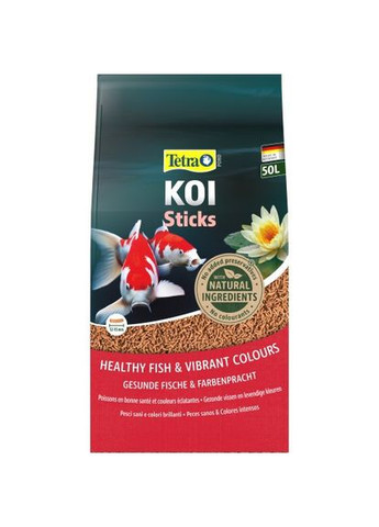 Tetra Pond Koi Sticks – це повноцінний і збалансований корм у формі паличок для щоденного годування усіх видів коропів кої. Цей корм сприяє здоровому росту, зміцненню імунної системи та покращенню якості води. Нова протеїнова суміш і HUFA-Booster (високоненасичені жирні кислоти) забезпечують оптимальний ріст та сприяють підвищенню життєстійкості ставкових риб. Палички корму легко поїдаються і дуже добре засвоюються, що сприяє значному покращенню якості води. Високоякісні натуральні каротиноїди посилюють яскравість природного забарвлення. Розмір палички – 12-15 мм Упаковка корму придатна для вторинної переробки. Нова формула Pond Koi Sticks, його високоякісні натуральні інгредієнти і гарне засвоєння корму наповнюють ставкових мешканців життєвими силами, їхнє забарвлення стає яскравішим, а вода у ставку залишається чистою та прозорою. Інгредієнти: субпродукти рослинного походження, риба та рибні субпродукти, екстракти рослинних білків, зерно, дріжджі, молюски та ракоподібні, олії та жири, мінеральні речовини. Аналітичні компоненти: сирий протеїн 33%, сирий жир 5,5%, сира клітковина 2%, вологість 7%. Добавки: вітамін D3 1720 МО/кг, регулятори кислотності: лимонна кислота 274 мг/кг.