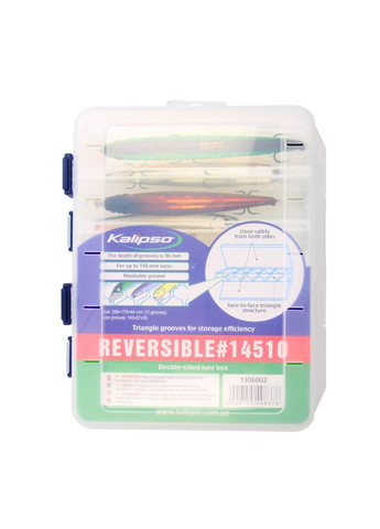 Коробка Kalipso Reversible 14510 — двостороння модель, яка ідеально підходить для зберігання і транспортування воблерів. Завдяки реверсивній конструкції дає змогу компактно розмістити достатню кількість приманок, які необхідні на риболовлі. Комірки V-подібної форми не дають воблерам перевалюватися з боку на бік під час транспортування, що зберігає їх від пошкодження власними гачками. Спеціальні вентиляційні отвори не дадуть волозі накопичуватися всередині коробки, завдяки чому приманки не окиснюватимуться. Коробка Kalipso Reversible 14510 виготовлена з міцного пластику, обладнана якісними поворотними петлями та широкими клямками. Для воблерів до 145 мм Кількість відділів 10 Розмір комірки, мм 145 х 27 х 36