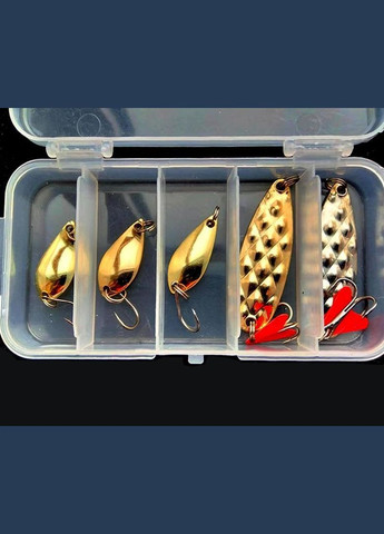Набір риболовних блешень з пір’ям і гачками, 5 шт (7 г / 10 г) + коробкаПрактичний комплект металевих приманок, розрахований на ловлю хижої риби у прісних і солоних водоймах. У наборі — 5 блешень вагою 7 і 10 грамів у привабливому золотистому кольорі. Кожна приманка оснащена якісним гачком та яскравим оперенням, що створює ілюзію живої наживки та стимулює атаку з боку хижака.Компактна прозора коробка, яка входить у комплект, забезпечує зручне транспортування та зберігання приманок.Підійде як для берегової, так і для човнової риболовлі на щуку, судака, окуня та іншу хижу рибу.У комплекті:5 металевих блешень (7 г і 10 г)Гачки з яскравим пір’ямПрозора коробка для зберігання