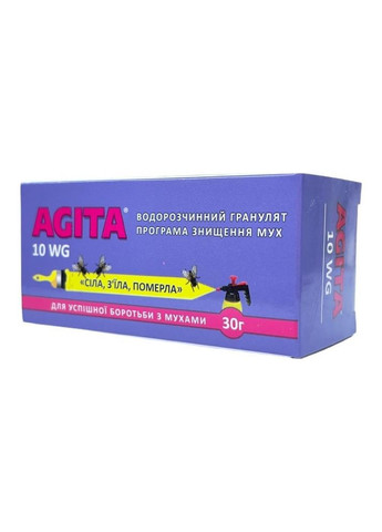 Агіта, 30 г — сучасний інсектицидний засіб у формі водорозчинних кристалів для швидкого знищення мух, ос, бліх, тарганів, постільних клопів, мурах, комарів. Активна речовина: тіаметоксам — 10%, трикозен (повий феромон мух) — 0,05%, приманка — 89,5%. Переваги: - До складу входить феромон для мух, який приваблює комах до місць нанесення препарату. - Дія настає через 3-5 хвилин, повне знищення комах досягається впродовж 24 години після застосування. - Остаточна дія зберігається впродовж 4-8 тижнів. - Кристалічний засіб добре розчинний у воді. Застосування: перед використанням препарат треба розчинити в теплій воді. Знищення шкідників Норма витрати Спосіб і особливості оброблення Таракани 30 г/0.5 л води обробити місця проживання та шляхи їх проникнення в приміщення: щілини, уздовж плінтусів, уздовж труб водопровідної системи, щілини в стінах, за дверними коробками. Можливе використання підкладок, встановлених у недоступних місцях Мухи (2 способами): 1) 30 г /250 мл води 2) 30 г/ 1,5 л води 1) наносять за допомогою пензля на підкладки з поліетилену або пергаменту, у розмірі 10х30 см по 5-6 штук і розміщують на 8-10 м2 поверхні. 2) вливають в обприскувач і обробляють площу 40 м2 Постільні клопи 30 г/0.5 л води обробляють місця проживання комах: щілини в стінах, меблях, за плінтусами, боку килимів, картин, відходження шпалер Мурахи 30 г/0.5 л води для боротьби з типами рудих домових, садових та інших мурах обробляють поверхні по стежках пересування й скупчення комах. Можливе використання підкладок, годівниць встановлених у недоступних місцях Оси 3-5 приманок масою 5-6 гр на приміщення 10 м2 використовують сухі гранули засобу, поміщені на підкладках, розставляти приманки в різних місцях у приміщеннях, куди залітають оси Комари 30 г/1 л води суспензією зрошують місця посадки: скло вікон, рами, стелю, стіни, одвірки дверей, а також стіни підвалів, сховищ, складів, ангарів