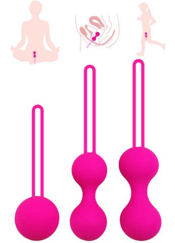 Набір силіконових вагінальних кульок з 3 штук для тренування та зміцнення м'яза піхви з обтяжувачами. У набір входять одна кругла кулька і дві здвоєні кульки різної ваги та діаметра. Розмір та вага: - Маленький одинарний: діаметр 3,5 см, загальна довжина 12 см, довжина мотузки 8,5 см, вага 36 грам. - Подвоєні середні: діаметр 3 см, загальна довжина 16 см, довжина мотузки 8,5 см, вага 48 грам. - Подвоєні великі: діаметр 3,2 см, загальна довжина 16,5 см, довжина мотузки 8,5 см, вага 63 грам. Матеріал: силікон, метал. Упаковка: крейдована картонна коробка з написами (без зображення продукту) та здвоєний пакет-саше (одна сторона – прозора, інша – фольгована).