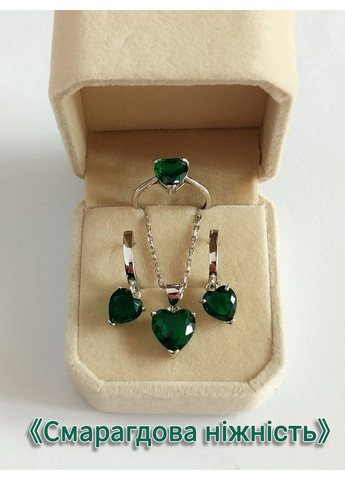 Комплект "Сердечки зелений смарагд у сріблі" - класичний набір: регульоване кільце, кулон на ланцюжку і сережки з ювелірного сплаву з цирконами - солідний подарунок дівчині в стильній святковій упаковці. Виробник ювелірної біжутерії преміум-класу знову радує нас новинкою: комплектом із сережок, кільця та кольє у вигляді романтичного серця з яскравим зеленим каменем під натуральний камінь смарагд в оправі з медичного сплаву з покриттям сріблом 925 проби. Розміри невеликі і підходять більшості дівчат, жінок (вимірювання зроблені в ручну і не претендують на високу точність): - сережки на англійському замку з підвісками 6 - 8 міліметрів - ланцюжок завдовжки 45 сантиметрів - регульоване кільце від 16 до 19 мм. Догляд за ювелірною біжутерією: Вироби довгий час радуватимуть своїх власників при правильному догляді та акуратному поводженні!
