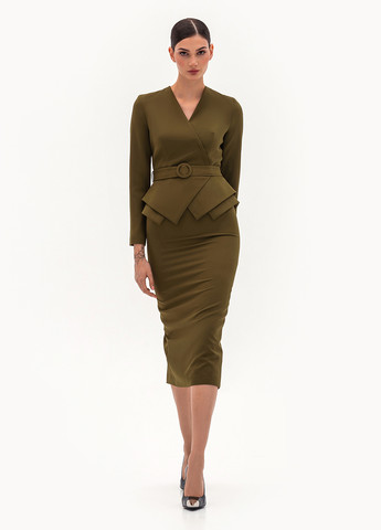 Вид виробу: комплект брюк, що складається з двобортного, подовженого жилета, з коміром і лацканами, з бічними розрізами, асиметричними деталями на поясах-зав'язках з пряжкою і вільних, широких штанів зі складами. Силует, довжина: вільний, максі. Посадка по лінії талії: класична. Щільність та вид тканини: середньої щільності текстильний матеріал з додаванням еластану. Вигляд застібки: відлітні пояси на пряжці в жилеті, блискавка і гачки в штанах. Наявність підкладки: присутня в жилеті. Наявність та вид кишень: кишені у рамку з клапаном у жилеті, підкрійні кишені у штанах. Виріз горловини: V-подібний. Вид рукава без рукава.