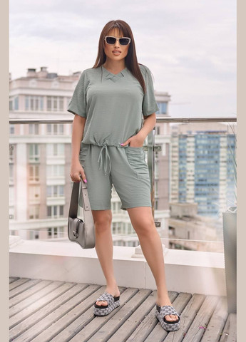 Костюм - двійка Тканина- американський креп Літній костюм блузка з шортами-для тих хто любить комфорт і свободу рухів, у спеку - цей костюм буде ідеальним, універсальним і стильним варіантом літнього сезону. Шикарно, модно та практично. Блуза вільного крою, з V-образним вирізом на горловині, знизу можна затягнути куліску . Шорти вільного вільного силуету з накладними карманами, пояс на гумці. Виріз на горловині та кишені застрочені декоративними складками. Блуза 50-52 - ог-110, от-106, об-112, довжина бл.- 55 см, довжина рукава-27 см. 54-56- ог-118, от-116, об-122, довжина бл.- 56, довжина рукава-27 см. 58-60- ог- 128, от -124, об-132, дов. бл.- 58 см, довжина рукава -28 см, обхват рукава- 40 см. 62-64 - ог -134, от- 130, об-138, дов. бл- 60 см, довжина рукава- 27, обхват рукава- 42 см. Шорти вільного крою з кишенями, на резинці: 50-52 - от- 110, об-120, довжина шорт - 50 см 54-56- от-110, об-128, , дов.шорт- 52 см 58-60- от-126, об-138, дов.шорт- 53 см. 62-64 - от-134, об-144, дов. шорт- 53 см.
