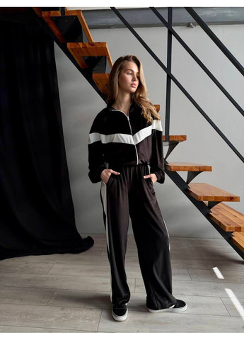 Елегантний костюм, що поєднує стиль і комфорт. Виконаний із м’якого велюру, він приємний на дотик та дарує відчуття затишку. Куртка з довгим рукавом, коміром-стійкою та блискавкою спереду підкреслює сучасний силует. Шорти на високій посадці з еластичним поясом забезпечують зручність та свободу рухів. Контрастні вставки на куртці додають виразних деталей, створюючи стильний акцент.