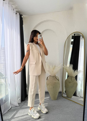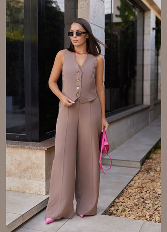 Жилетка має приталений крій, який підкреслює талію та додає образу вишуканості. Вона ідеально поєднується з широкими брюками палаццо, які вільно струмують по ногах, створюючи ефект легкості та елегантності при кожному кроці. Висока посадка штанів і стрілки вздовж штанин візуально подовжують ноги і роблять силует стрункішим.