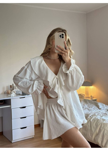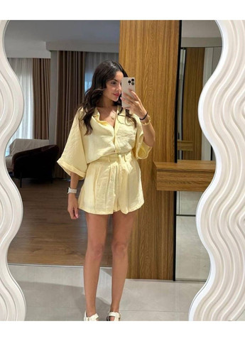 Легкий літній костюм трійки на дівчаток. У комплект входить: топ, штани, сорочка. Тканина: американський креп жатка. Топ з тканини мустанг рубчик білого кольору. У шортах є кишені.