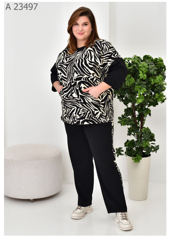 Жіночий костюм батал у класичному чорному кольорі — вдале поєднання елегантності та комфорту. Комплект складається з прямих штанів і блузи з акцентом на прозорі рукави. Вони виконані з сітки з флоком і сріблястим напиленням, яке делікатно мерехтить і надає образу святкового вигляду.
