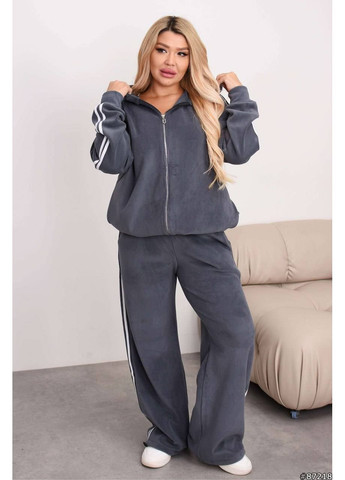 Костюм виготовлений з велюру, який має плюшеву фактуру. Тканина має гарну еластичність, враховуйте це під час підбору розміру. Завдяки своєму оверсайз фасону костюм гарно сідає по фігурі. Кофта з довгими рукавами на м'яких манжетах, плечовий шов спущений, що створює вільний силует. Також кофта має капюшон зі шнурком та застібається по всій довжині на блискавку. Додатково має накладну кишеню-кенгуру, яка декорована нашивкою. Штани фасону джогери з високою посадкою, талія на гумці без застібок. По боках присутні дві кишені з відрізним бочком.