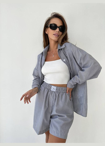 Костюм виготовлений з льняної тканини в смужку, яка має гладку фактуру. Тканина має мінімальну розтяжність, враховуйте це під час підбору розміру. Завдяки своєму вільному фасону гарно сідає по фігурі. Сорочка подовженого крою з довгими рукавами, плечовий шов спущений, що створює вільний силует. На сорочці відкладний комір, присутня одна кишеня на грудях та рядок великих ґудзиків. Штани фасону палаццо з високою посадкою, талія по спинці на гумці та не має застібок. На штанах присутні дві кишені з відрізним бочком. Сорочка: 48-50 р-р: ОГ 120, ОС 120, довжина сорочки 75, довжина рукава 55; 52-54 р-р: ОГ 130, ОС 130, довжина сорочки 76, довжина рукава 56; 56-58 р-р: ОГ 140, ОС 140, довжина сорочки 77, довжина рукава 57; 60-62 р-р: ОГ 150, ОС 150, довжина сорочки 78, довжина рукава 58; Штани: 48-50 р-р: ОТ 70-104, ОС 120, довжина штанів 108; 52-54 р-р: ОТ 74-112, ОС 128, довжина штанів 109; 56-58 р-р: ОТ 78-118, ОС 136, довжина штанів 112; 60-62 р-р: ОТ 82-126, ОС 142, довжина штанів 113; Виміри робились по верхній частині готового виробу. ОГ — об'єм грудей. ОТ — об'єм талії. ОС — об'єм стегон.