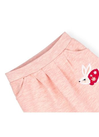 Штанці зручні, звужені до низу, з двома передніми прорізними кишенями та з модними фіксованими закомірми по низу. Прикрашені аплікацією маленького зайчика, як на світшоті. Спереду штани вільні, у поясі зібрані складками та без середнього шва. Еластичний пояс з подвійної трикотажної гумки посилений додатково вставленою широкою гумкою, забезпечить дитині повну свободу рухів і оптимальну посадку по фігурі.