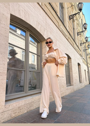 Костюм виготовлений з натурального льону з ефектом "жатки", який надає тканині легкої текстури та об'єму. Це надає виробам розслабленого і невимушеного вигляду, що ідеально підходить для літнього гардеробу. Жатий льон добре пропускає повітря, забезпечуючи комфорт у спекотні дні.